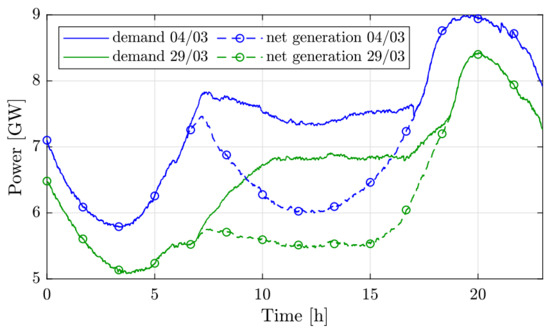 Comparison of the total demand and conventional generation in Israel during 24 h on two sunny days: 4 March and 29 March 2020.