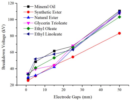 | Electrode gaps/mm | Mineral Oil | Synthetic Ester | Natural Ester | Glycerin Trioleate | Ethyl Oleate | Ethyl Linoleate |