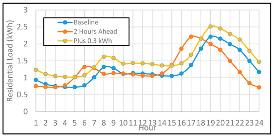Simulated residential load is originally taken straight from the input data with variability introduced by adding or subtracting a random number of hours within a range of −3 to +3. This generates the effect of residential households being on different schedules. The load simulation was improved based on initial results to perform a range of variations, horizontal and vertical, based on user input, or randomly within a range. In the CES case, systems are combined into one, having a combined energy generation and load. The IES case uses the same load profiles as the baseline. Figure 3 shows example load variations performed on a 24-h time frame. The blue “Baseline” shows an example 24-h load without any variance. There is typically a small peak when residents are getting ready for work and a larger peak later in the afternoon when they return. The orange line shows a load profile shifted “horizontally” two hours ahead. The peaks occur at hour 6 and 17 instead of 8 and 19. The yellow line shows a load profile shifted “vertically” by 0.3 kWh. The peaks occur at the same time as the baseline but are larger.