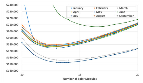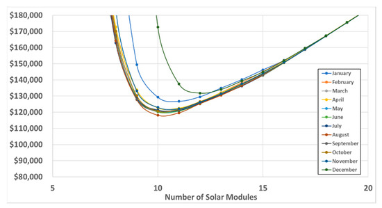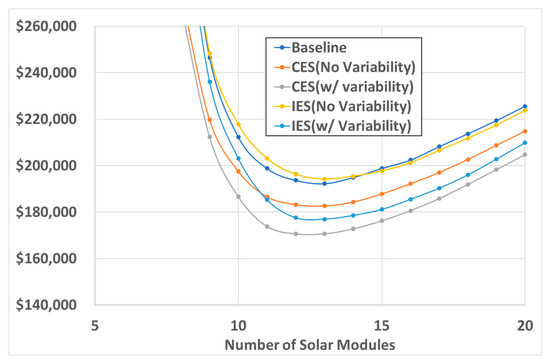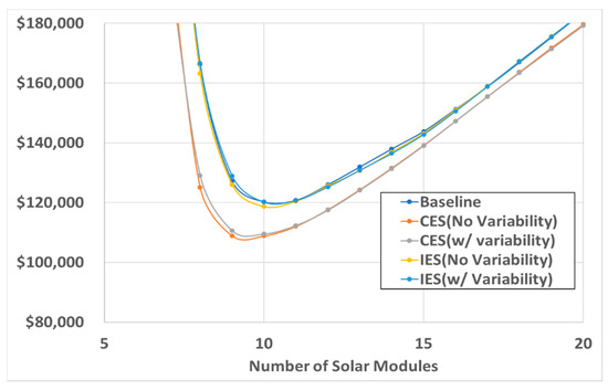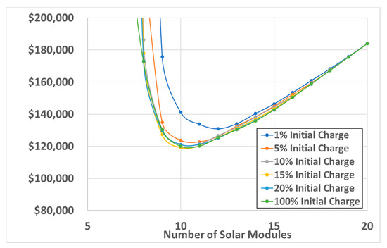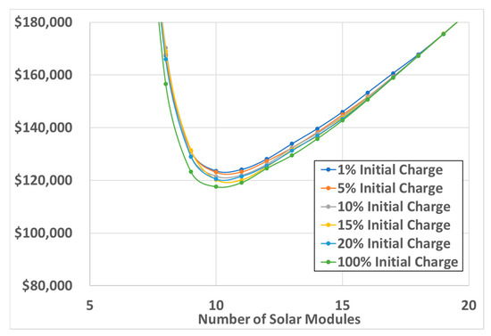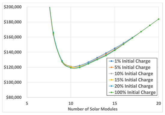 The unit cost of the solar panels and energy storage, given by Costunit, will change over time for example due to the ending or starting of subsidies, technology improvements, and changes in the market. To show how these changes in cost might affect the analysis, case studies of +/− 15% were included for the energy storage and solar panel unit costs with initial charge (10%), number of systems (five), geographic location (Indianapolis), required reliability (nine hours a year or 0.1% LPSP), and starting month (June) kept constant.