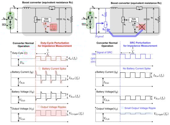 Illustration diagrams for battery impedance measurement methods: conventional duty cycle perturbation method (left) (Reproduced with permission from [5], IEEE, 2017) and the proposed switched resistor circuit (SRC) perturbation method (right).