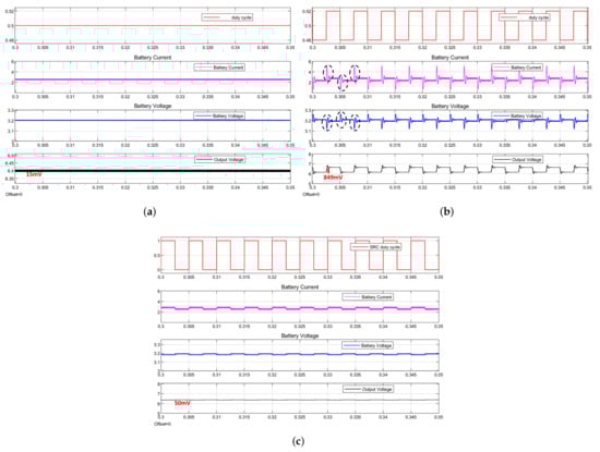 On the contrary, Figure 4c shows the waveforms of the duty cycle to the switch of the SRC, battery current (), battery voltage (), and output voltage (). The ripple of the output voltage of the proposed SRC method is only 50 mV, which is around 0.7% of the corresponding DC output voltage. Compared with the 849 mV (13%) of the conventional duty cycle perturbation method (see Figure 4b), the output ripples are significantly reduced by the proposed method. Moreover, it can be observed in Figure 4b,c that the large spike of battery current/voltage in the conventional duty cycle method during the transient switching is automatically eliminated in the proposed method due to the adoption of the resistor.