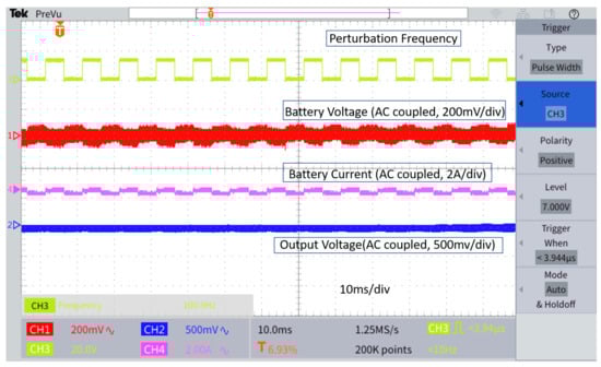 Figure 6 shows the sample waveforms for the PWM voltage of the SRC, battery voltage, battery current, and output voltage of the power converter of the proposed SRC perturbation method under a 100 Hz perturbation frequency. It can be found that the proposed SRC method has smaller output ripples as compared with the duty cycle perturbation method. In [5], the duty cycle perturbation induced large output voltage ripples, which were around 0.38 V. However, in the proposed method, the output voltage ripple induced by the SRC perturbation is only around 0.02 V, which is around 19-times smaller than the conventional duty cycle perturbation method.