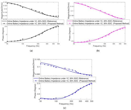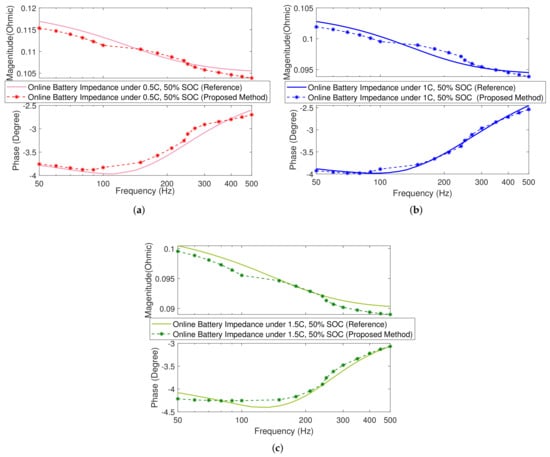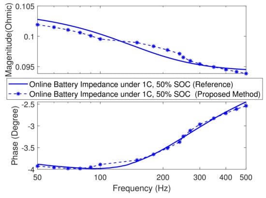 Figure 9 shows the comparison of the online battery impedance obtained under 0.5C, 1C, and 1.5C discharge currents by the reference method and the proposed method, respectively. The results show a good match. The overall measurement error is less than 5%. The overall trend is that the battery impedance decreases with the increase in the current rate. More specifically, there is a 4.5 m increment from 0C to 0.5C, a 16 m increment from 0.5C to 1.0C, and a 2.4 m increment from 1.0C to 1.5C.