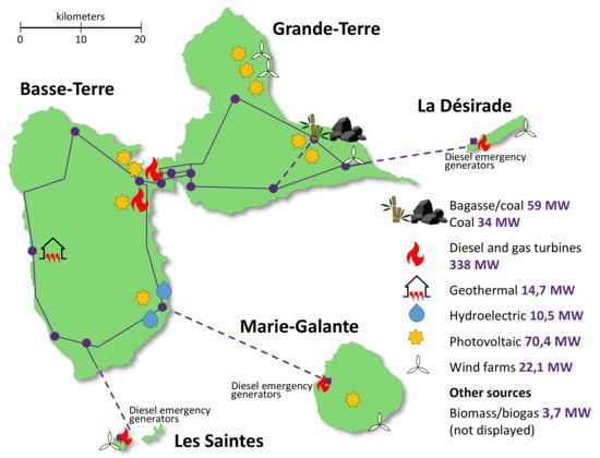The Guadeloupe Archipelago is a Non-Interconnected Zone that must produce all the electricity it consumes, where Électricité de France (EDF) is a public utility (production, single buyer, transport, distribution and marketing) [35]. For this, submarine cables connect each of the islands to the loops of overhead lines covering Basse-Terre and Grande-Terre. The installed capacity of Guadeloupe’s electrical grid is of 556.46 MW. The archipelago is a territory almost totally dependent on thermal non-renewable sources (coal, diesel and combustion turbines), and of the electricity consumed comes from these fossil fuels.