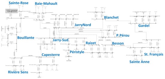 Guadeloupe’s PowerFactory model of electrical system shown in Figure 2 was implemented from the data presented in Reference [37]. The shaded area corresponds to the point of common coupling located within the Sainte-Rose node, where the HPP is connected.