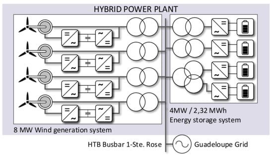 However, in recent years, Guadeloupe has adopted renewable energies. In 2017, its electricity mix consisted of more than of renewable energy. Thus, apart from coal, diesel, and fuel, several renewable sources are used to produce electricity on the island territory: solar (photovoltaic), geothermal, wind, hydroelectric and biogas. For this, different projects have been developed in order to size and install renewable power plants in this territory, as shown in Figure 1 [36]. This paper proposes a study to assess and validate the operating of a new hybrid wind/storage power plant at a particular point of the Guadeloupe electric grid (Sainte-Rose).