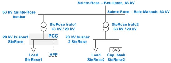 The hybrid power plant is connected through a point of common coupling located within the Sainte-Rose node, as can be seen in the grid’s PowerFactory model in Figure 4. As shown, the Sainte-Rose node comprises a 63 kV busbar connected to 63 kV/20 kV transformers and two 20 kV busbars (Terminals 1 and 2), and, at the same time, it is connected to the main busbars at the neighboring substations Bouillante and Baie-Mahault. Terminal 1 relies on a local load and serves as a point of common coupling for the HPP. Meanwhile, terminal 2 relies on a load and a static var system.