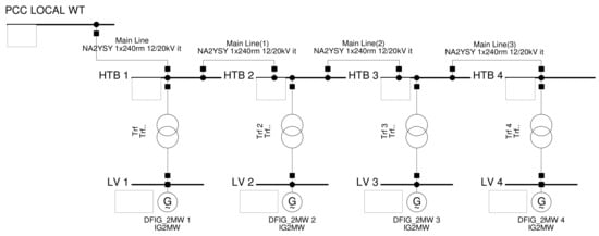 The wind generation system’s single line diagram described by PowerFactory software is depicted in Figure 5. As shown, this system consists of four 2 MW WTs based on Doubly Fed Induction Generators (DFIG) with their respective rotor-side converters (RSC) and transformers.