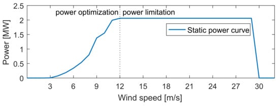 The power curve of the wind turbine modeled is displayed in Figure 6. This curve presents the steady-state electrical power obtained from simulation for wind speeds ranging from start-up wind speed (3 m/s) up to shut-down speed (29 m/s). In this operating mode, in order to get a constant power output above nominal speed, the pitch angle was adjusted accordingly to control the stall effect. On the other hand, between start-up speed and nominal speed (12 m/s), the power output is maximized.