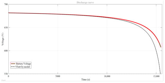 Figure 7 shows the battery discharge curves at constant current obtained by the proposed model, compared with the SimPowerSystems battery model available on the MATLAB/Simulink [41,42]. For that, the discharge current considered was (A), whereas the minimum voltage for the battery was 609 (V) [38]. The model presents a linear section that indicates the charge that can be extracted from the battery before the voltage drop below its nominal value (). Within this region, the state-of-charge lies between and of the battery’s nominal capacity.