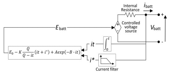 The Tremblay model describes the output voltage of a cell as a function of the capacity in ampere hours (Ah) that have been obtained from it [41]. According to this model, the battery cell is represented by a voltage source with variable magnitude in series with a resistance.