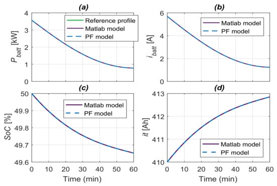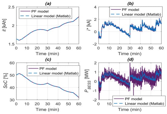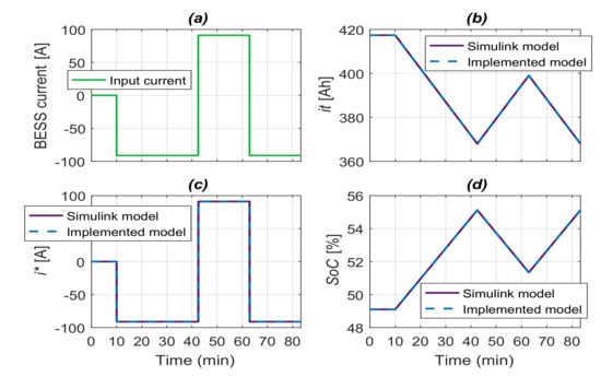 The validation test results are presented in Figure 12. Figure 12a shows the reference power profile is followed by the battery power signals obtained from the two battery models. The resulting BESS current, state-of-charge (), and integral current () signals are presented in Figure 12b–d. The state-of-charge limits are set at and . A sampling time of 1 s was used in the simulations. As can be seen, the power signals are superposed, indicating the model proposed can be used in the control strategy.