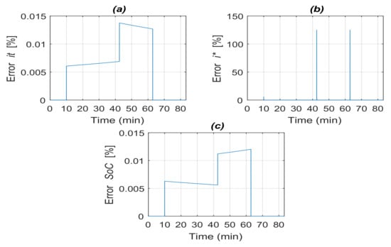 The errors in the model for the signals and are close to zero (Figure 10a,c). Meanwhile, Figure 10b reveals an error caused by a delay between the signals obtained. Error peaks take place when the input current changes. However, for the control objectives of the EMS, these errors would be compensated by the controller as will be seen in the next section.