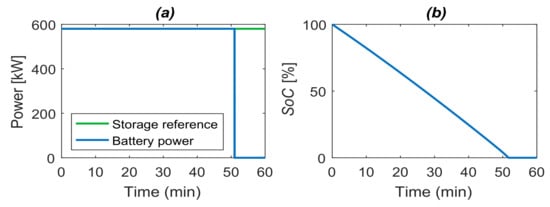 In an additional test, the initial state-of-charge was set at , and the minimum and maximum limits, at 0 and . Figure 11a presents the discharge of the 1 MW/580 kWh storage system obtained from the nonlinear model in MATLAB. Furthermore, the power reference was defined to withdraw 580 kWh from the battery during 1 h. As can be seen in Figure 11b, the power followed the reference until the reached after 52 min. The validation of a standalone storage unit allows confirming that this storage model is suitable for implementation in the hybrid plant model in the PowerFactory environment.