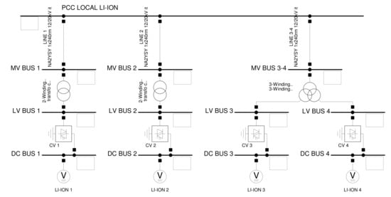 According to the data presented in Reference [37], of the load in Guadeloupe can be considered static, representing mainly home appliances. For the sake of simplicity, in the grid model implemented in this paper, all the loads were assumed to be static and invariant with respect to the frequency and voltage changes.
