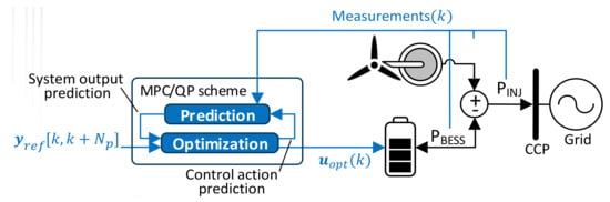 The power dispatch of the wind/storage HPP is a problem without a priory knowledge of future events in the environment. Indeed, the instant WT production and other measurements in the hybrid plant are input information received at every calculation to solve the optimization problem. This problem, therefore, requires reactive optimization. More recently, Model Predictive Control (MPC) has received greater attention from the energy management microgrids community. This control strategy has the ability to include both forecasts and newly updated information to determine the system’s future trajectories, while efficiently handling different kinds of constraints [27]. The main advantages of MPCs are the handling of constraints, as well as multi-variable and nonlinear models. Furthermore, it integrates the disturbances and future variations in the references to the optimization problem. Nonetheless, it is frequently combined with optimization methods, such as quadratic programming [28,29] or Pareto solutions [30].