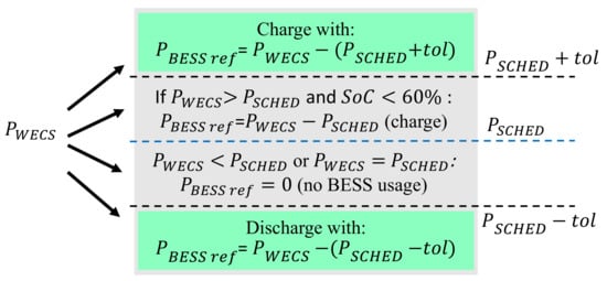 According to the HPP’s characteristics, the EMS proposed should ensure the continuous power injection from the wind-storage HPP into the Sainte-Rose substation on the island’s electricity grid, according to the commitment profile generated on the basis of the wind forecast. Under those circumstances, the optimization problem consists of deciding on how to use the battery energy storage system (i.e., which part of the production is used to charge the BESS or how much power is to be discharged) as the WTs output instantly varies, to transfer to the island grid according to a committed generation schedule.