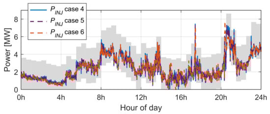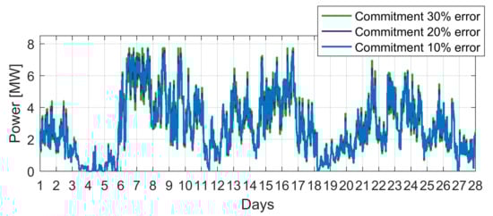 Table 6 summarizes the results obtained from 28-day simulations with three sets of values for and . These results confirm the importance of an optimized algorithm to better manage the energy flow of an HPP when dealing with a day-ahead commitment and demonstrates the effectiveness of the MPC-based strategy proposed.