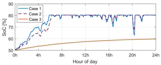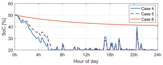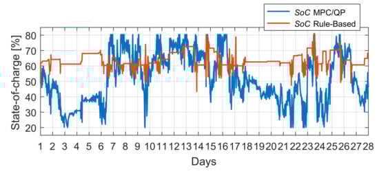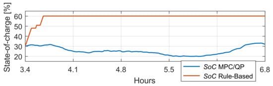 Figure 32 and Figure 33 plot the state-of-charge charts obtained from the MPC/QP and rule-based algorithms. As can be seen, on several occasions, the MPC/QP algorithm activates the constraints and , i.e., minimum and maximum allowed levels are reached several times. Under the rule-based algorithm, the SoC control evolves between the and levels.