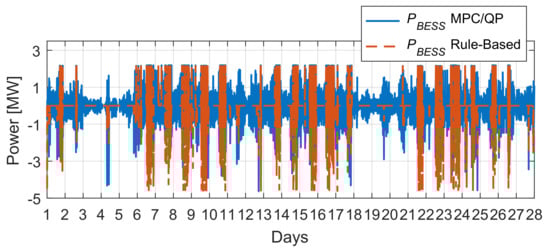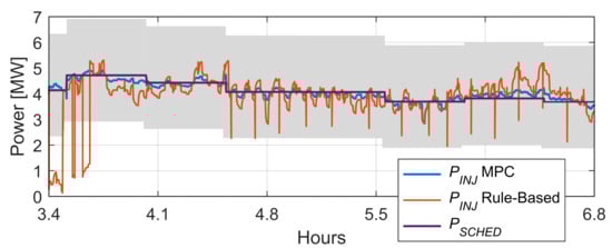 As can be seen in Figure 31, the signal obtained from the algorithm based on simple rules is zero most of the time. This is because when the is smaller than , and, whenever is bigger than , the storage system is charged accordingly to the rules. Moreover, after the level is reached, several short time charges take place. On the other hand, the MPC-based controller manages the BESS responding to the instant active power needs (the difference between planned injection and current production).