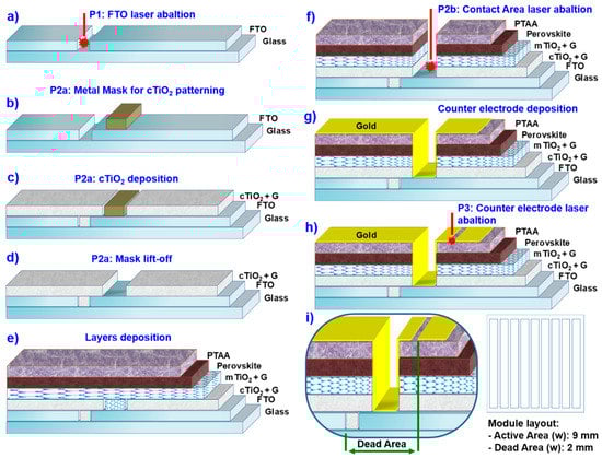 In order to develop a process directly scalable to the industrial level with the requirements of simplicity, robustness, and repeatability, module sub-cell interconnections are obtained with the P1, P2, and P3 ablation sequence by using a 10 ns pulsed Nd:YVO4 UV laser (λ = 355 nm) as shown in Figure 1. The proposed module layout consists of 9 series- connected cells with an active area of 9.23 cm2 each one with the following layer sequence: FTO/cTiO2+G/mTiO2+G/perovskite/PTAA/Au.