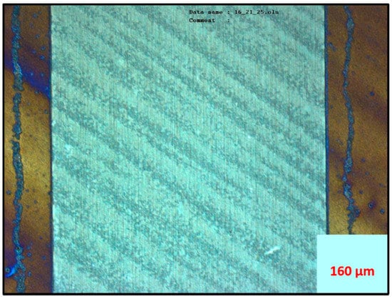 In addition, during the fabrication of large-area module, glass bending, layer deposition defects such as pinholes due to the specific employed deposition technique or environmental conditions, as well as non-homogeneous perovskite crystallization, could occur by affecting the layer morphology and thickness uniformity across the device active areas. In order to prevent FTO damages during P2 process and at the same time to achieve a robust ablation taking into account the substrates’ inhomogeneity, we repeated the laser ablation two times, by setting an optimized 248.8 mJ·cm−2 laser fluence for each ablation step. The obtained ablated area is clearly visible in the optical microscope picture reported in Figure 2.