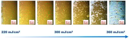 Since, during the second ablation step, the FTO is strongly exposed to the laser radiation, we checked the goodness of P2 ablation by repeating the process 2 times using the same fluence value for both steps. We tested the process at different laser fluence from 220 mJ·cm−2 to 360 mJ·cm−2. Optical images reported in Figure 3 show that laser starts to induce damages to the uncovered FTO surface when fluence value overcomes 75 µJ·cm−2. Thus, the use of laser fluence below 300 mJ·cm−2 is able to prevent FTO damages even in the case of two consecutive P2 laser ablation processes.