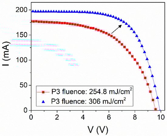 P3 parameter optimization and the relative I-V curves for the as-realized modules. In particular, module realized employing a non-optimized laser fluence (254.8 mJ·cm−2) during P3 (square symbols—red line) demonstrated power conversion efficiency (PCE) of 11.23% while module realized employing an optimized laser fluence (306 mJ·cm−2) showed PCE up to 15.29% (triangle symbols—blue line). The reported I-V curves were acquired under 1 SUN illumination.