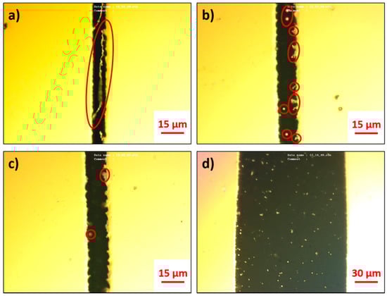 Optical images for 150 nm thick gold layer evaporated over a glass substrate to test the gold removal during P3 by employing 4 different scribing processes: (a) single laser process employing a pulse fluence of 221.2 mJ·cm−2 and resulting in 12 µm width scribe; (b) single laser process employing a pulse fluence of 306 mJ·cm−2 and resulting in 13.5 µm width scribe; (c) single laser process employing a pulse fluence of 354 mJ·cm−2 and resulting in 15 µm width scribe; (d) ablated area in the case of a 130 µm width scribe obtained by using a raster scanning distance of 3 µm and a pulse fluence of 306 mJ·cm−2.
