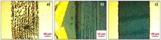 P3 laser ablation microscope analysis: (a) Optical image for a 130 µm width P3 scribe obtained by using a RSD of 3 µm and a pulse fluence value of 221.2 mJ·cm−2. In this case, the presence of electrical bridges between module constituting sub-cells due to an incomplete gold removal is clearly visible; (b) Optical image for a 130 µm width P3 scribe obtained by using a RSD of 3 µm and a pulse fluence value of 354 mJ·cm−2. In this case, the layer delamination on the edge of the ablated area is due to excessive stress experienced by the gold film during the P3 ablation; (c) Optical image for a 130 µm width P3 scribe obtained by using a RSD of 3 µm and a pulse fluence value of 306 mJ·cm−2. The as-optimized P3 ablation resulted in an ablated area with negligible gold residual flakes and sharp edges without layer delamination.