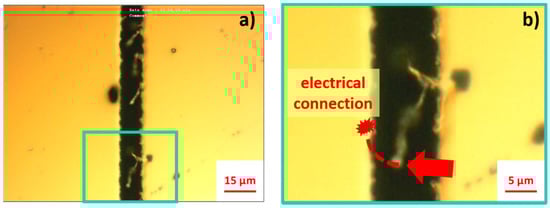 Single P3 laser scribe (12 µm width), panel (a) points out residual gold flakes with dimensions comparable to the scribe width (b) magnification of the residual gold flakes region along the P3 scribe (green rectangle in panel (a)), by emphasizing a possible shunting mechanism occurring upon the application of an external pressure, commonly employed during the panel lamination process.