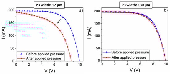 A clear VOC (−12.8%) and FF (−20.2%) reduction was observed after the application of the external pressure, testifying to the detrimental effect of the gold residual flakes among adjacent cells. Remarkably, the final PCE (10.45%) was 31.7% lower than the value measured before the lamination process. All the electrical module characteristics before and after the application of the lamination pressure and the relative variations are summarized in Table 2. This detrimental effect is not occurring by using a P3 ablation width of 130 µm, as shown in the I-V curves reported in Figure 8b.