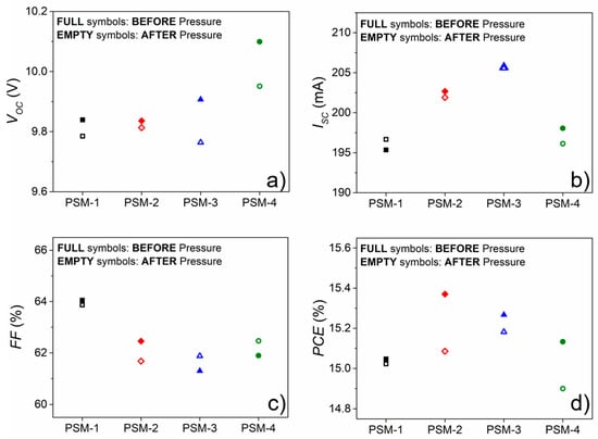 Electrical parameters related to 4 modules, realized by employing the optimized P3 process and extracted by the I-V curve acquired before (full symbols) and after (empty symbols) the applied pressure, miming the pressure experienced during a standard lamination process.(a) open-circuit voltage VOC; (b) short-circuit current density JSC; (c) fill factor FF and (d) power conversion efficiency PCE.