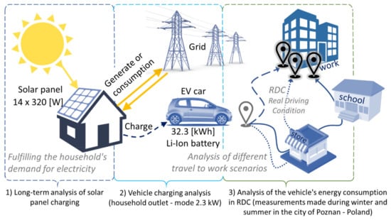 The aim of this study was to evaluate the energy flow generated by the solar panels, followed by analysis of the energy flow during vehicle’s charging and the energy consumption in the RDC test. The analysis of energy generation from photovoltaic panels was carried out during the same periods as the vehicle tests, i.e., in winter and summer periods in 2020 on the territory of Poznan city in Poland. In the same periods, the average driving energy consumption was also estimated. The following questions were posed: How much energy does a city electric vehicle consume during its intended operation periods? Is the applied 4.48 kW photovoltaic installation able to guarantee an electric vehicle’s energy demand in the assumed driving scenarios? The scope of the research included two test runs compliant with the RDC test procedure in urban, rural, and motorway cycles in winter and summer conditions of 2020. The measurements were made in the ECO driving mode, which in earlier studies [34] showed a beneficial reduction in energy consumption by the vehicle. The measurements made in the same driving mode allowed the estimation of the impact of weather conditions on the overall energy consumption of the vehicle on selected road sections. The data from the test run were recorded in real-time based on the information pulled from the vehicle controller area network (CAN) by a dedicated on-board diagnostics system (OBD) scan tool. The main parameters that were recorded during the measurements in the actual traffic conditions of the vehicle were those describing the operation of the electric motor (rotational speed, value of the current and voltage, and torque and vehicle speed) and the parameters concerning the accumulation of energy in the battery (state of charge (SOC), and power).