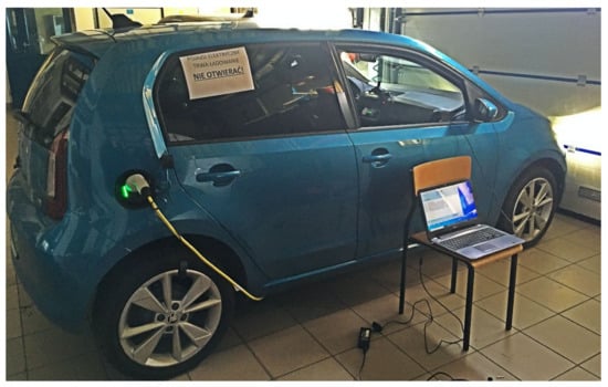 The full charge time increases with decreased charging power. Charging profile of the first mode—2.3 kW (AC)—was observed over one full cycle. The charging level (±0.1%), voltage (±1 V), and current (±0.01 A) were sampled with 1.3 Hz and were registered from vehicle’s CAN in real time. The observation setup is shown below in Figure 3.