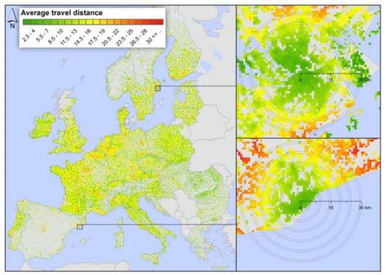 Average travel distances (km) in Europe, with focus on Stockholm and Barcelona, showing the dependence of the average distance on the distance from the metropolitan area [49].