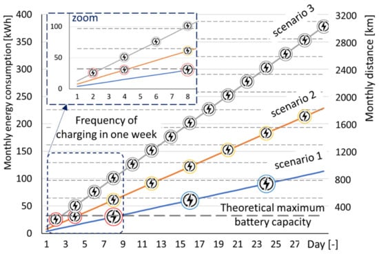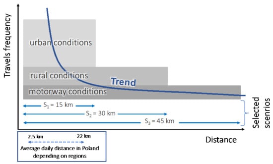 Based on described trends [50] of dependency of distance and travel frequency and information about average distances covered in Poland [49], three different distances have been selected to analyze (Figure 5). Scenario 1 assumes a 15 km distance per day focusing on an urban area. Consequently, scenarios 2 and 3 concern the suburban areas where the residence is a farther distance from the workplace.