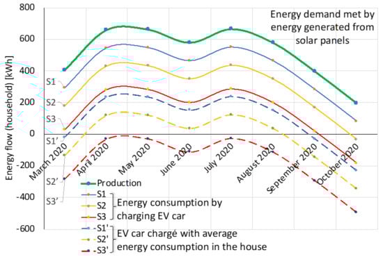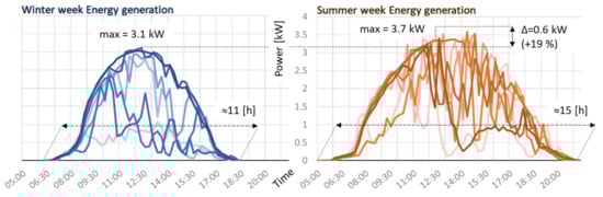 The differences between energy generation in the summer and winter months were significant. Shortening the time of solar radiation of the panels by 30% reduced the maximum power generated by 19% (Figure 7), resulting in a total reduction in the share of accumulated energy by about 40% (energy gain in June was 664.5 kWh while in March only 406.7 kWh). Such large differences in the total values of energy produced raises doubts about the ability to meet the energy demand for both the power supply to the building and the electric vehicle.