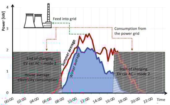 The compiled daily electricity production characteristics (Figure 7) were averaged and presented in relation to the daily usage pattern of the electric vehicle (Figure 8). Part of the energy produced during the day (around the afternoon hours) was transferred to the power plant, because at this point, the energy was not used for the household’s needs. The graph shows the maximum vehicle charging time with a discharged battery. Charging time, in this case, is long also because of the choice of basic charging technology. In the absence of energy production by photovoltaic panels, the energy needed to charge the vehicle (as well as other home usage) was drawn back from the power plant.