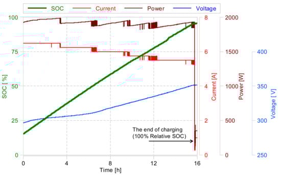 The charging profiles, represented by SOC, power, and voltage, are shown in Figure 9. The authors did not optimize the charging process. Algorithms implemented by the vehicle manufacturer controlled the charging. Battery charging from 15.2% to 95.6% lasted almost sixteen hours. The charging process was carried out by constant current (CC) mode, i.e., with approximate constant current and variable voltage using the original manufacturer household charger. The voltage rose from 296.25 V to 351.75 V at the end of charging. At the same time, the current value was changing significantly. At 96% of SOC, current reduced to slightly above 0, and with it, large voltage variations were observed. When the car was not being used and had a full battery, the charger ensured stand by energy consumption. The battery delivered 30.16 kWh energy after one charging cycle.