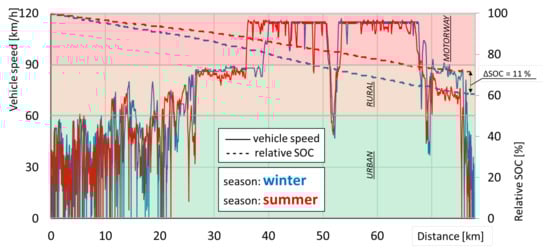 The driving cycles, realized in compliance with the RDC procedures, were started at 100% battery SOC level (software readout). The test runs were performed by a single driver to assure consistency in the driving style. Compared to the previous analysis results of the driving energy consumption in the RDC test [34], this article focuses on the determination of the total energy consumption by route sections: urban, rural, and motorway under different atmospheric conditions. The vehicle velocity and relative SOC profile during the RDC tests are shown in Figure 10. Presented curves marked in blue and red colors represent different ambient conditions. Vehicle speed and state of charge are represented by solid and dotted lines, respectively. In the tests with similar conditions achieved during the measurement journeys, the indications of the vehicle speed in relation to the distance travelled showed a high similarity to the journey, both in the urban part and in the sections with increased speeds. Some differences in the speed on the suburban and highway routes were dictated by road conditions, and there was no possibility to repeat them.
