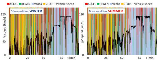 The driving cycles, realized in compliance with the RDC procedures, were started at battery level SOC 100% (software readout). The test runs were performed by a single driver to avoid inconsistency in the driving style. During the test run, the vehicle speed and battery level were recorded. Due to running the vehicle in ECO mode, the maximum speed was limited by the drivetrain controller; both runs were comparable speeds in the given test intervals, and nevertheless, the energy consumption was about 11% more in the winter period. For this reason, further work identifies the intervals of route split and vehicle speed affecting the increased energy consumption.