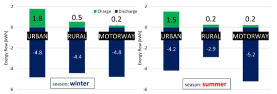 The energy balance as a function of the type of the road is shown below (Figure 12). Regardless of the weather conditions, similar energy recovery values were recorded. However, due to more vehicle stops during winter measurements, higher energy recovery was achieved in both the urban and suburban parts during winter measurements. The greatest amount of energy was recovered in the urban cycle due to the high number of brakings, compared to the smooth traffic road portions.