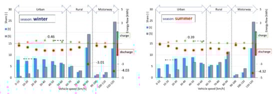 During the RDC test, the vehicle’s energy consumption was dependent on the road conditions. Increased energy consumption of the vehicle was noticeable in the higher speed ranges. The bar charts of Figure 13 show the energy flow and the share of energy consumption for different speed ranges. The marked points represent the total energy flow of both recovered (green) and consumed (red) energy in a specific speed range. The largest amount of energy was recovered in the 20–50 km/h range. The amount of energy recovered in the urban speed range allowed us to increase the vehicle range. However, the energy consumption in each speed range was higher than the recovered energy. The highest energy consumption was recorded in the intervals of increased vehicle speed, both during summer and winter driving conditions; in the speed range 110–120 km/h, the vehicle consumes more than 4 kWh (the distance covered at this speed is almost 25% of the entire RDC test). The shares of each speed interval in the test indicate nearly identical driving conditions in the urban route speed range (0–60 km/h) and in the motorway route range (v > 90 km/h).