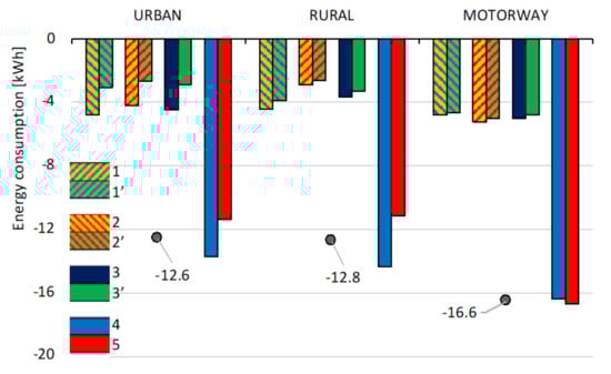 The specification of the assumptions used in the energy flow summation (Figure 12) are specified in Table 6. The assumptions for the urban, rural, and motorway segmentation of the route are consistent with the RDC test assumptions presented earlier (Table 2 and Table 3). The value of power delivered or generated from/to the battery was recorded during the measurements, with the following assumptions, the summed energy flows presented earlier were determined. These assumptions also apply to the energy consumption totals in Figure 14.