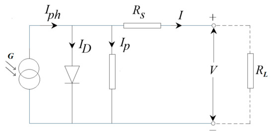 There are numerous PV models described in the literature, specifically the single diode model and two-diode model [26]. The main purpose of the model is to investigate the characteristics of PV modules that can be integrated into the virtual platform. The characteristic of SPV is simulated using a general equivalent circuit of a single diode configuration, as described in Figure 2. The term Iph denotes a photocurrent (source); G represents the irradiation; RL denotes the load resistance; and Rp and Rs are parallel and series resistances, respectively. Typically, the value of Rp is larger than Rs, hence these parameters are ignored to simplify the study. Essentially, a group of PV cells and modules are arranged in series and parallel to form PV arrays that are adapted to produce electricity in SPV generation systems.