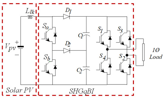 The modified qSBI is adopted with a reduced number of passive elements as compared with the Z-source inverter. It is an essential attempt to reduce the size of the inverter, because semiconductor devices occupy a lesser volume than the passive elements. In this work, the proposed topology is simplified by replacing the DC-link components with an embedded DC–DC converter and single-phase inverter. Because of this modification, the design of the conversion topology becomes easy. Figure 4 represents the proposed SHGqBI, and its modes of operation are classified as follows: