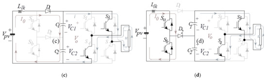 Mode 2 This mode is very similar to mode 1, except for the inverter operation. The embedded dc–dc converter repeats the operation and the dc voltage across the capacitors is maintained. The non-shoot through mode (Figure 5c) occurs between and the shoot through mode (Figure 5d) occurs between during the negative half cycle of the single-phase inverter. The performance study of this model can be derived using the same equations as derived in mode 1. The performance characteristics of the proposed SHGqBI during two modes of operations in terms of waveforms are illustrated in Figure 6.