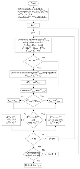 The output power () of the proposed system is determined from all the evaluated bats. If all bats are not evaluated, the order of the duty cycle is incremented by 1. The bat ratio is then updated and Equation (10) is repeated. With the bat evaluation, the best power is calculated from the initial bat population, given as below: